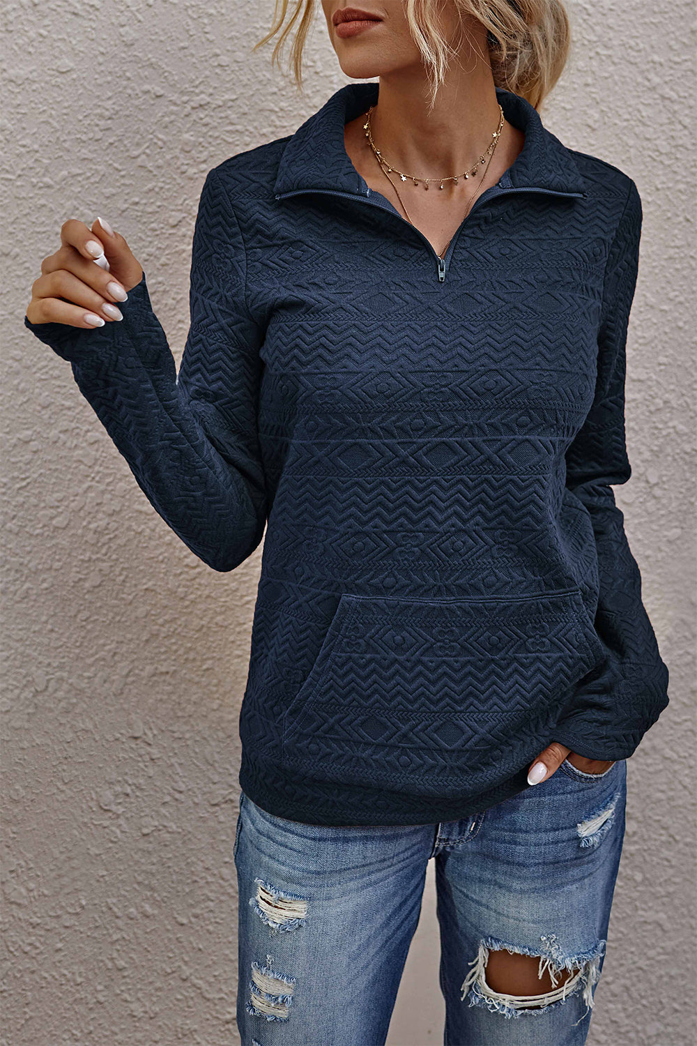 Quilted Pattern Quarter Zip Loose Sweatshirt with Pocket