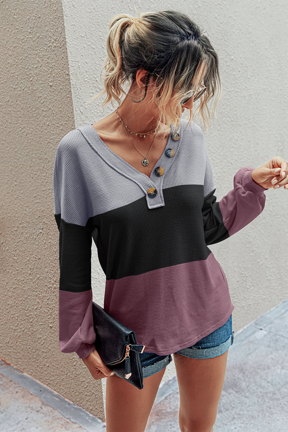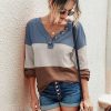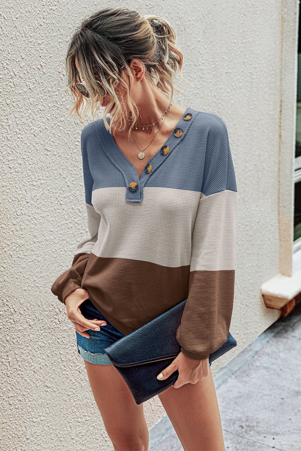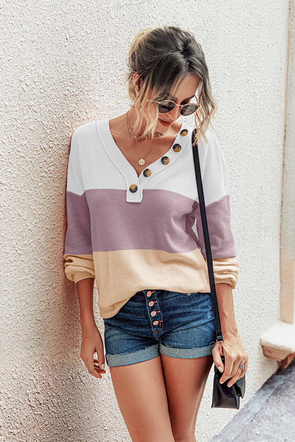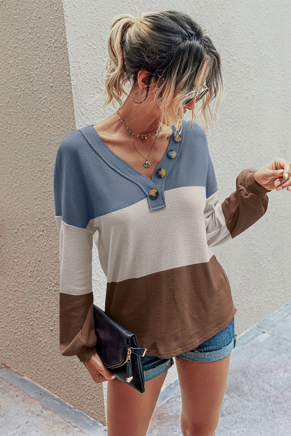 V Neck Button Raglan Sleeves Striped Blouse quantity