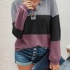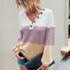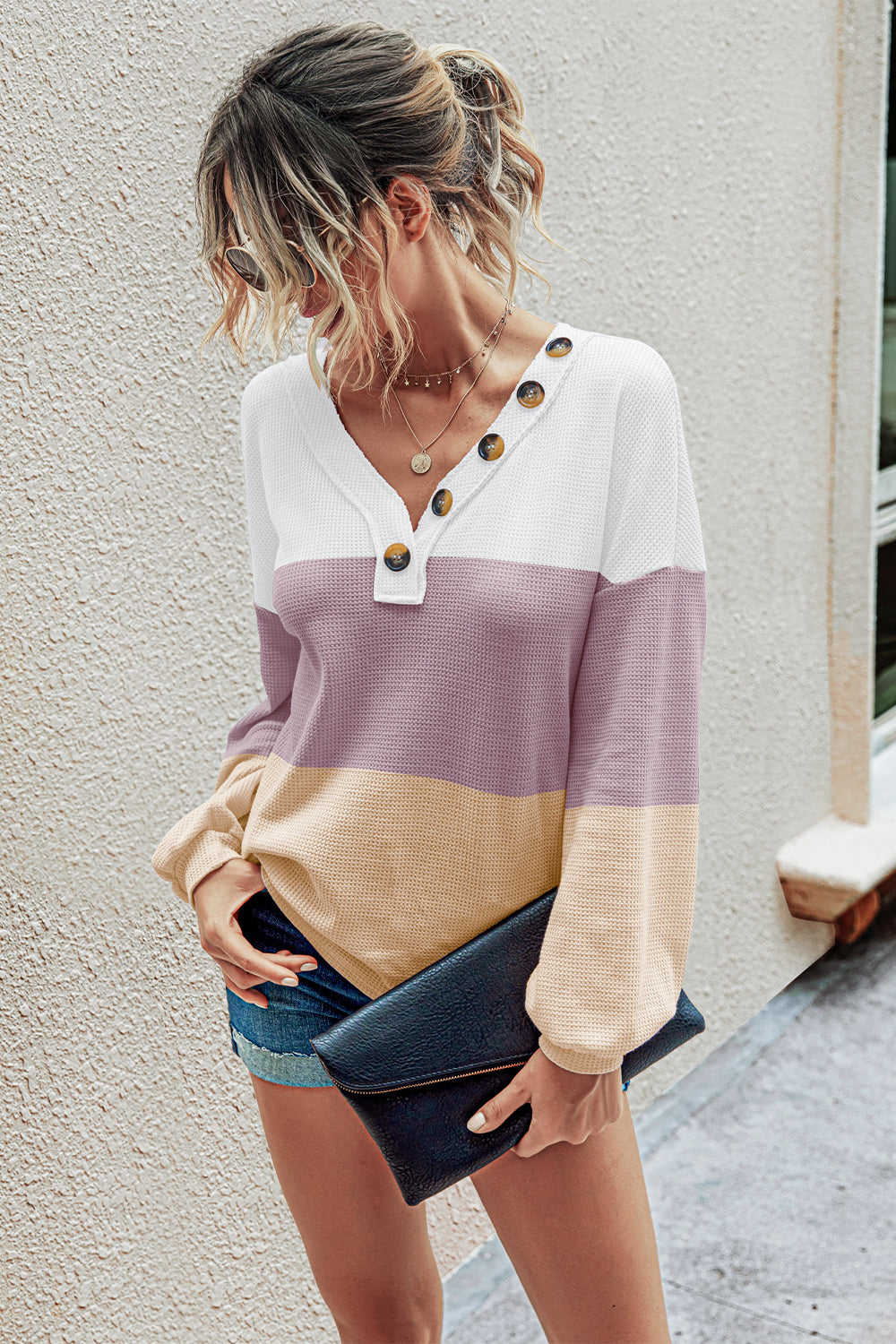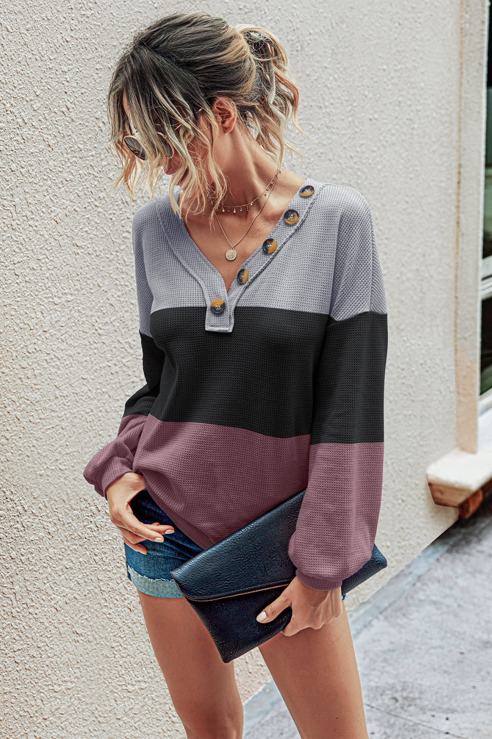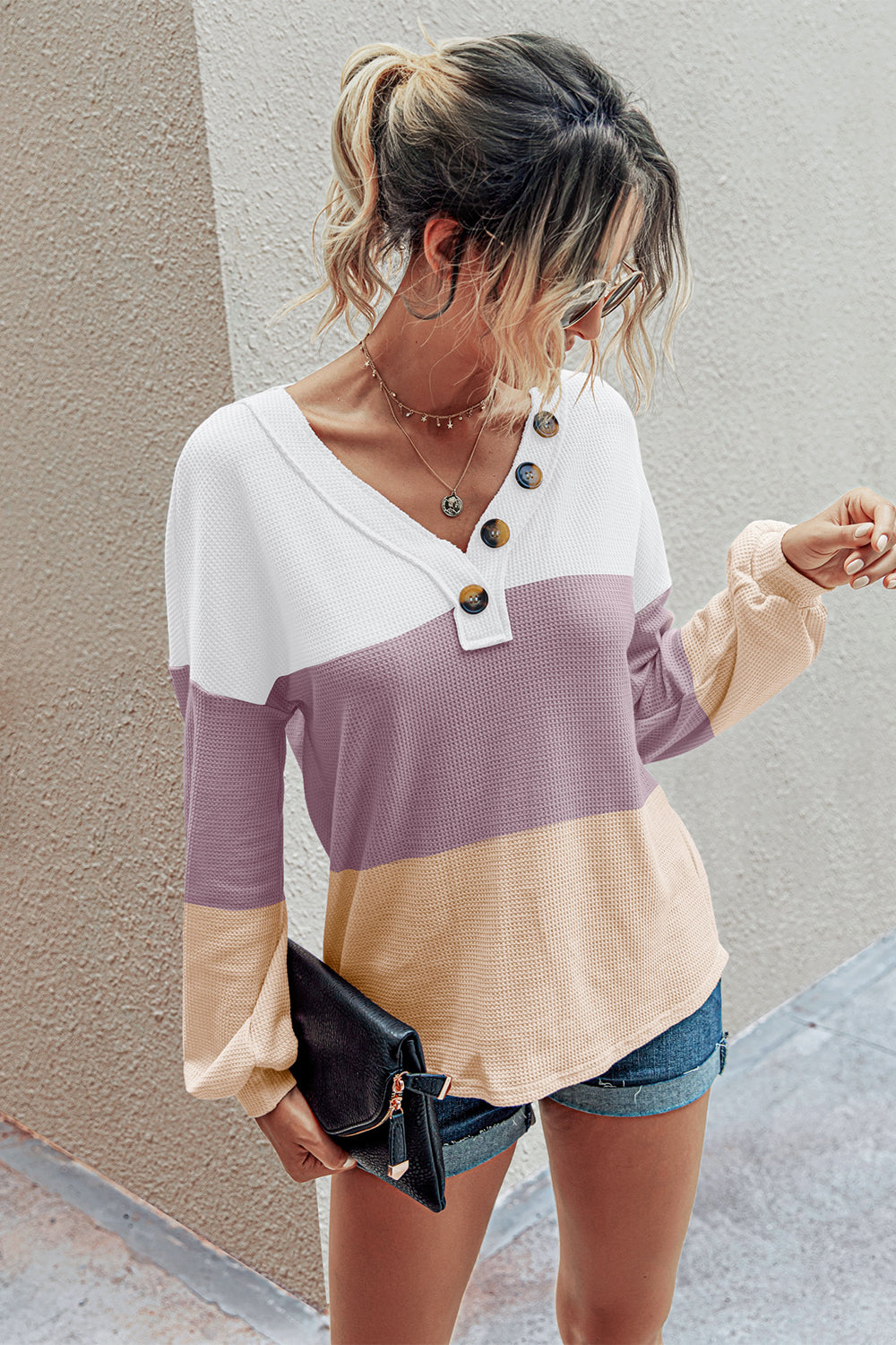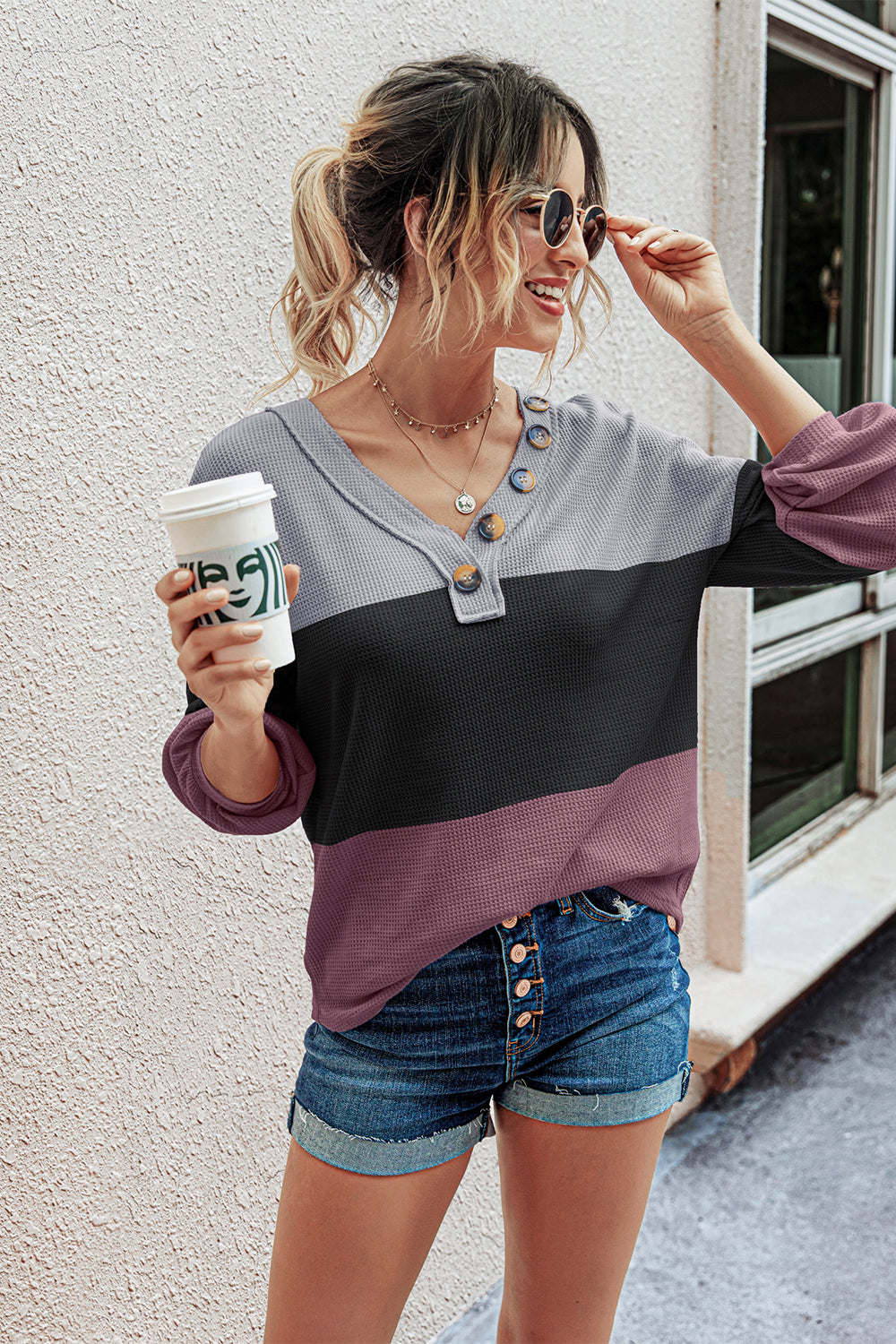 V Neck Button Raglan Sleeves Striped Blouse quantity